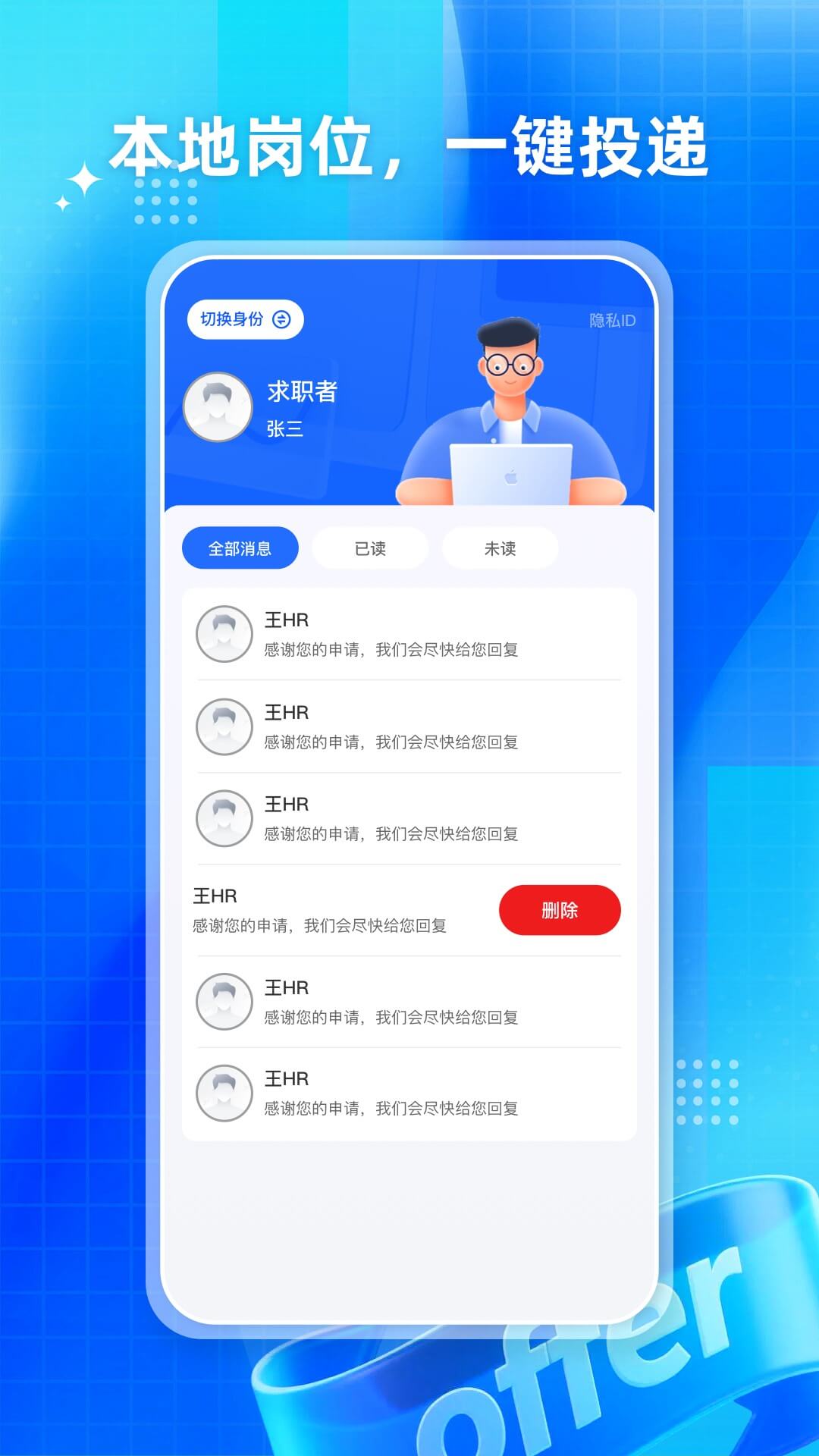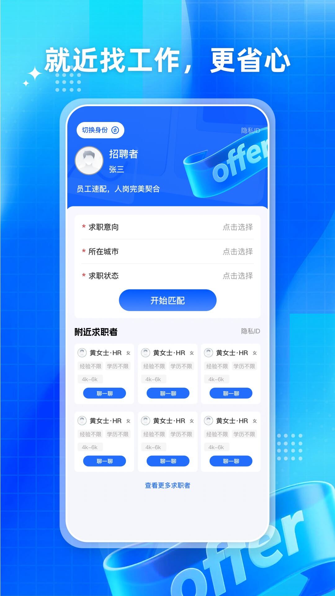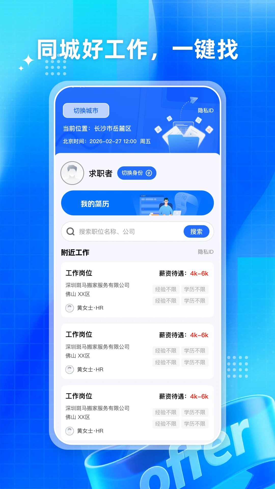 本应用专注服务求职者与招聘者,支持身份自由切换。求职者可根据自身需求快速筛选工作、在线编辑简历、一键投递,并与招聘者一对一沟通。招聘者完成平台核验后,可发布岗位、管理岗位(新增 / 撤销),根据用人需求智能匹配求职者,主动沟通高效对接。平台致力于打造便捷、安全、高效的求职招聘服务,助力人才与岗位精准对接。